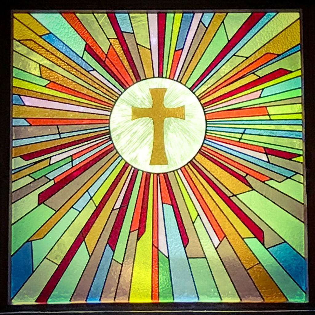 Installation du nouveau vitrail au dessus de l’entrée de l’église en juin 2025